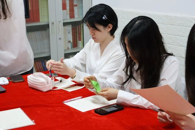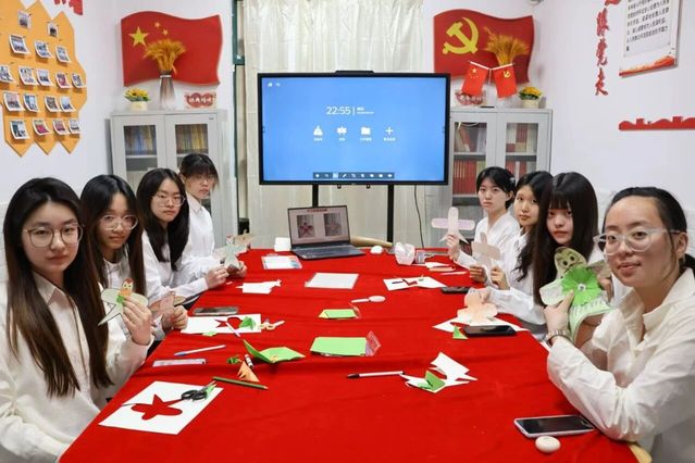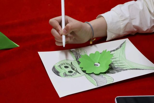 轻鸢摇曳衔春意,非遗手作敬英魂。同学们用彩色卡纸、A4素描纸、剪刀、丙烯马克笔等材料,亲手制作非遗纸鸢:折叠剪出缤纷纸花,勾勒纸鸢轮廓,为纸鸢主体上色,绘制传统纹样,再将剪纸花层层粘贴,让每一只纸鸢都承载着对春天的向往、对先烈的追思。