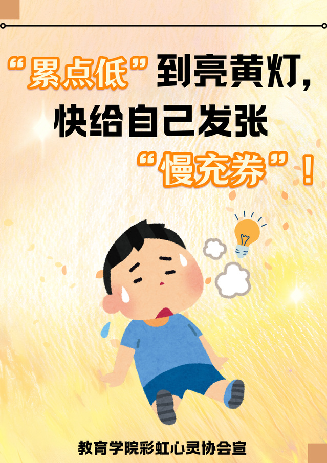 人生不必时刻满格奔跑,疲惫从来都不是我们的过错。累点亮起黄灯时,不必慌张焦虑,大方给自己发一张专属“慢充券”。好好休息,慢慢自愈,温柔照顾自己的情绪与身体。愿我们都能摆脱低累点的困扰,保持松弛,自在生活,向阳奔赴热烈美好的大学生活!