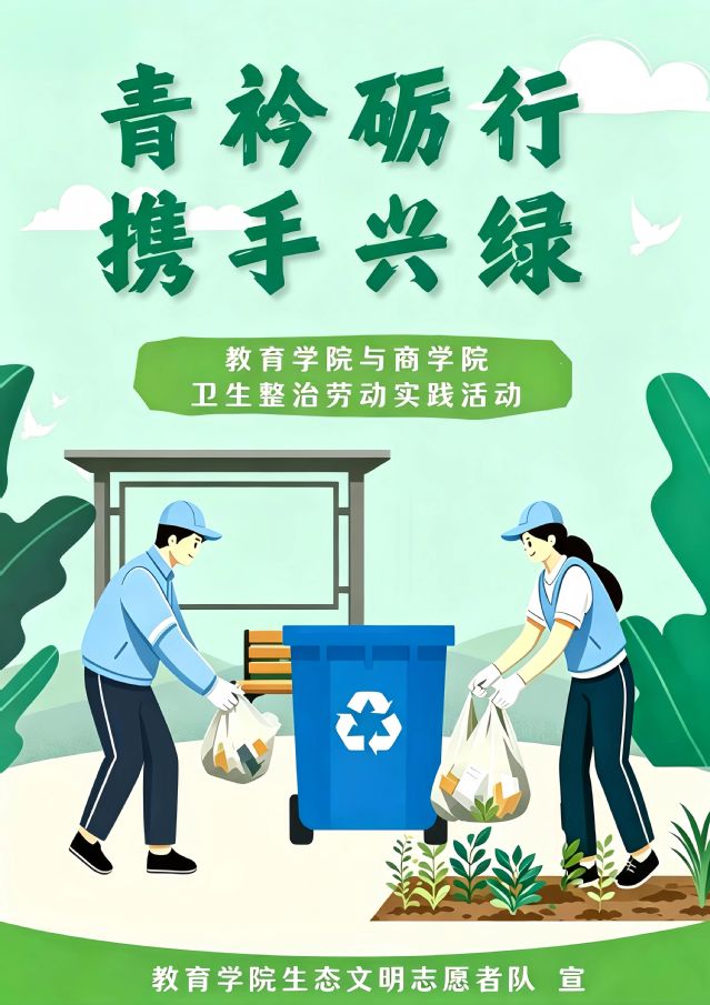 净域明心,力行致远。为优化校园周边卫生环境面貌,教育学院生态文明志愿者队积极响应生态文明总队工作部署,于2026年4月15日联合商学院共同开展校园周边卫生整治劳动实践活动。本次活动将环境治理与劳动教育深度结合,引导入党积极分子在亲身实践中强化责任意识、涵养奉献精神,既有效改善校园周边生态环境面貌,更让生态文明理念在实践中落地生根。